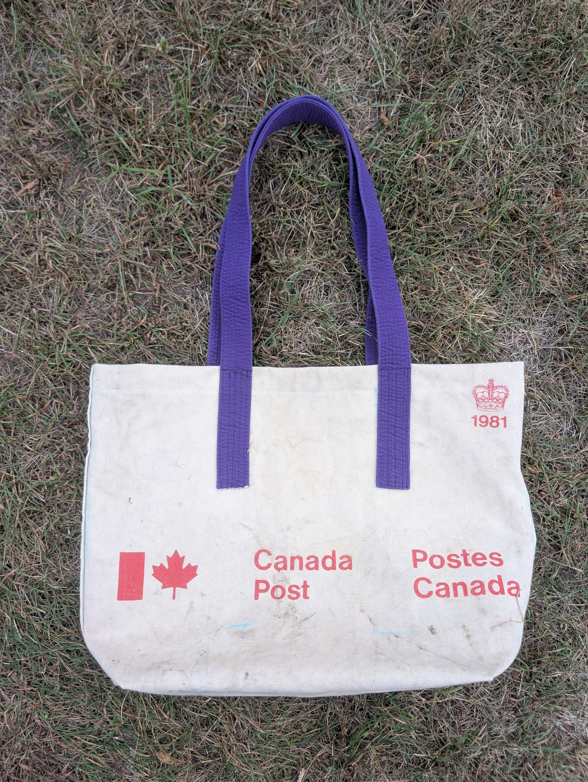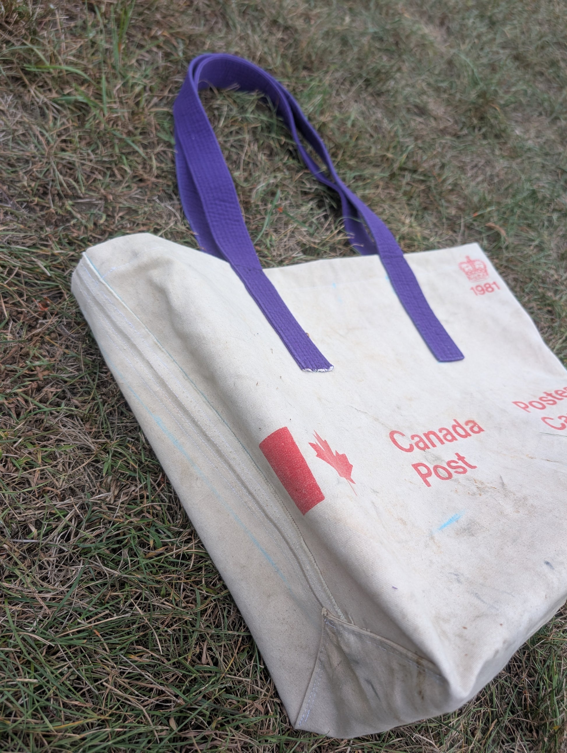 Reconstructed from a vintage Canadian post bag to be a shoulder tote with the use of a karate belt for the shoulder straps
