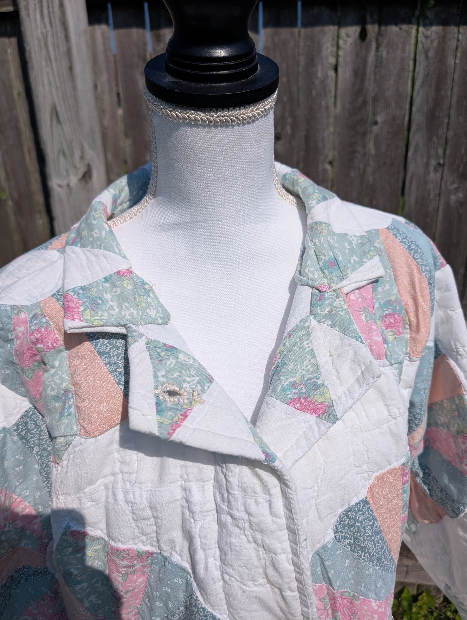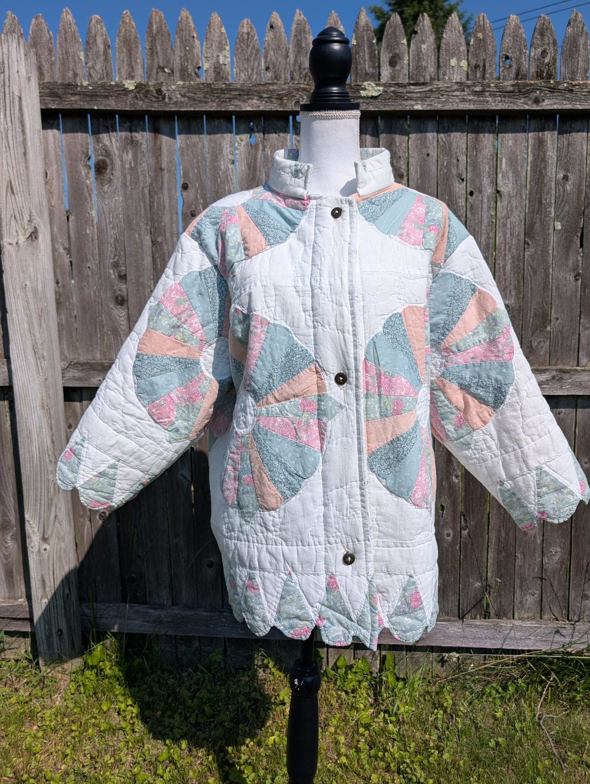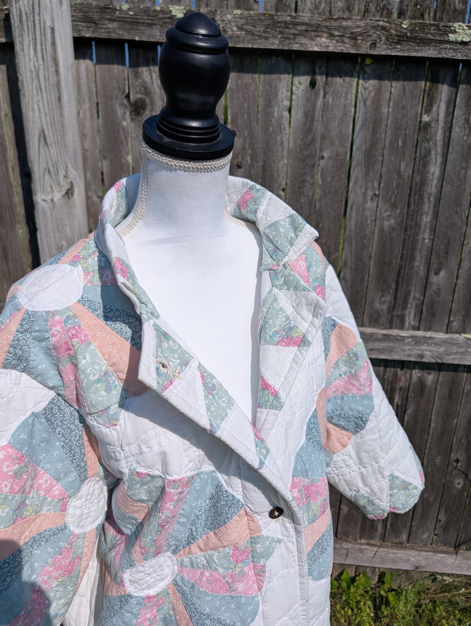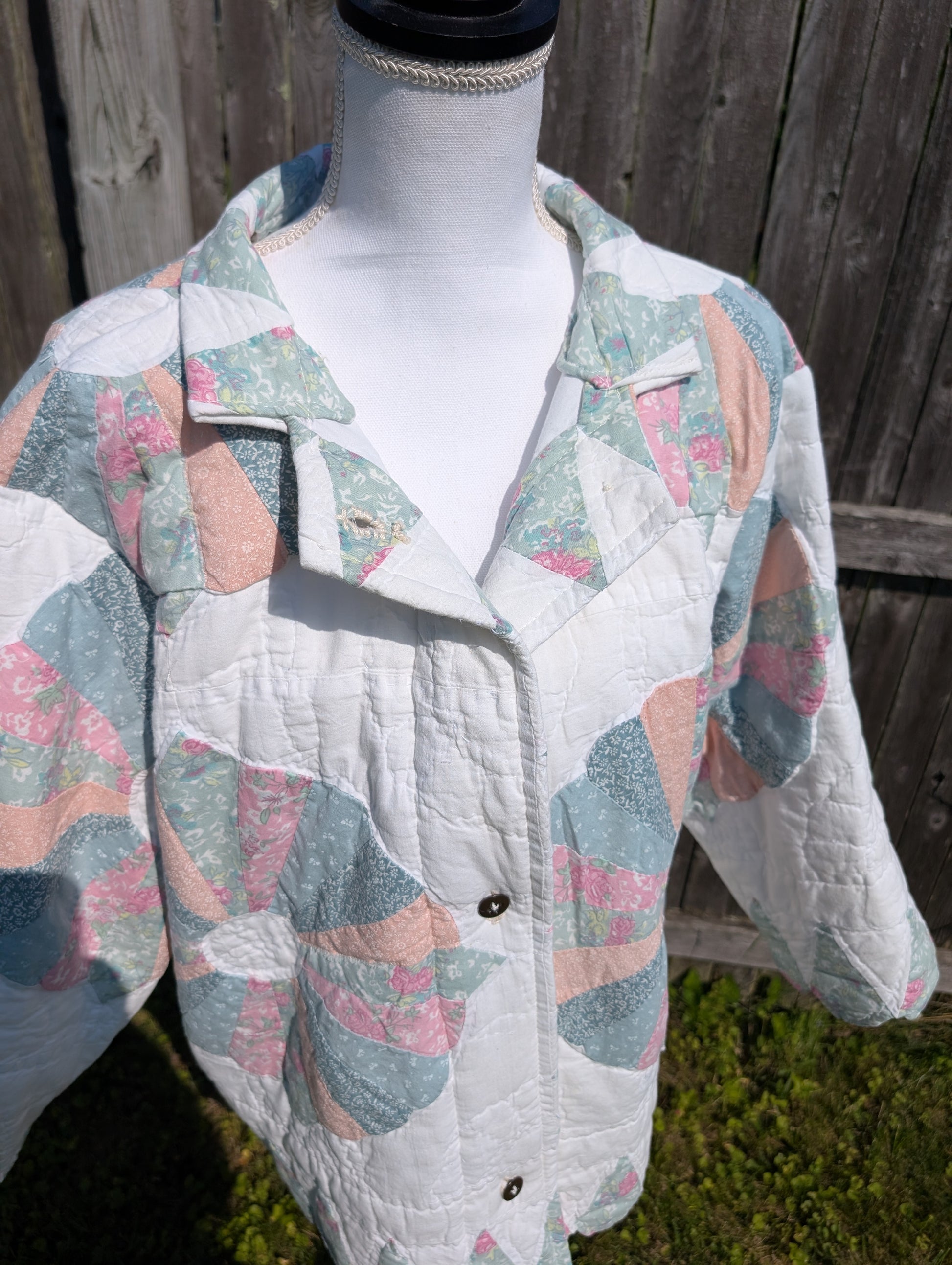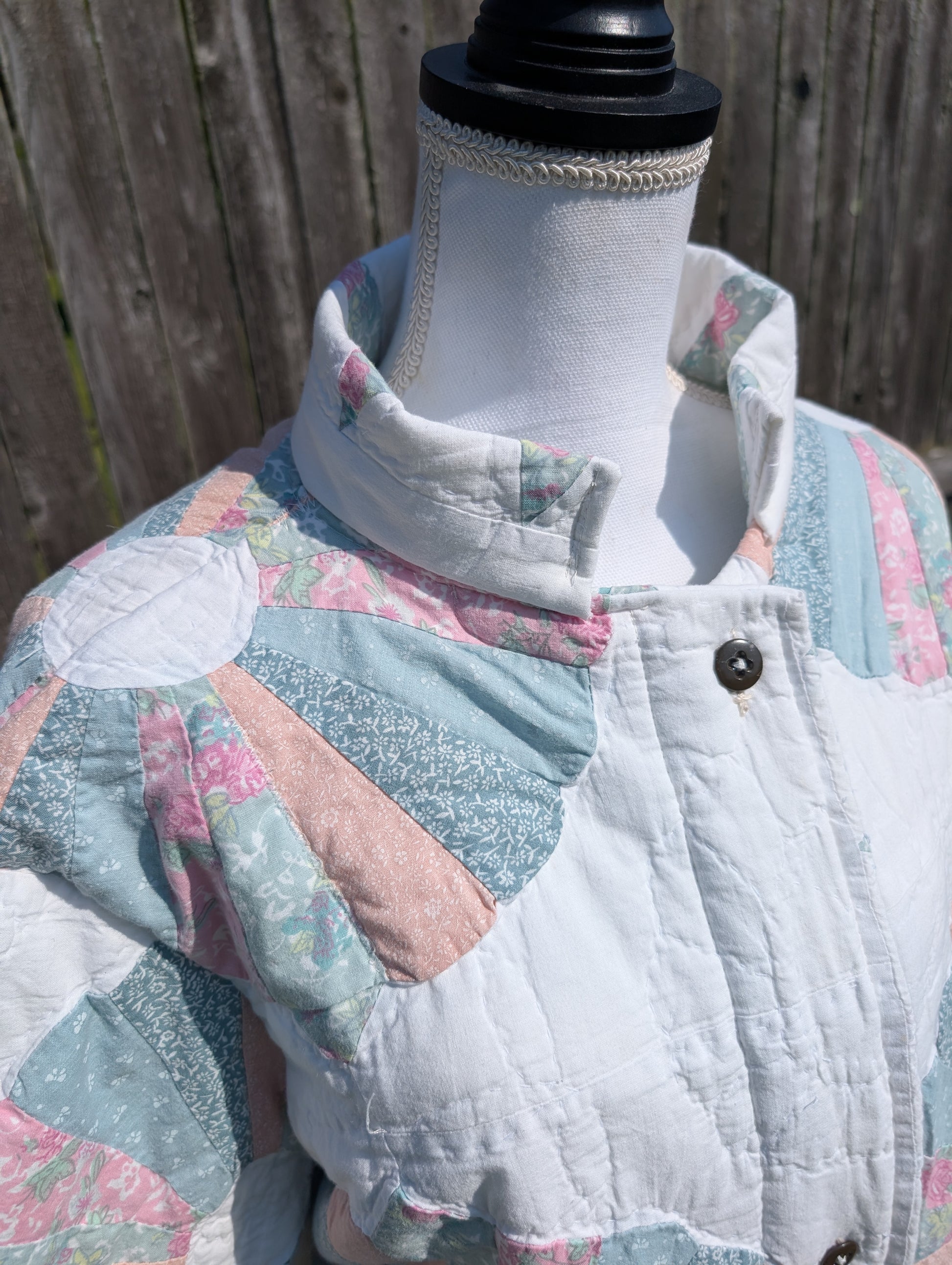Jacket handmade by me using a quilt. French seams inside. Three left side buttons hand sewn on. Fits like a boxy medium / cropped large. Some mending done on the quilt blocks. Please compare measurements with your own measurements as I do not accept returns / refunds. Thank you for understanding.