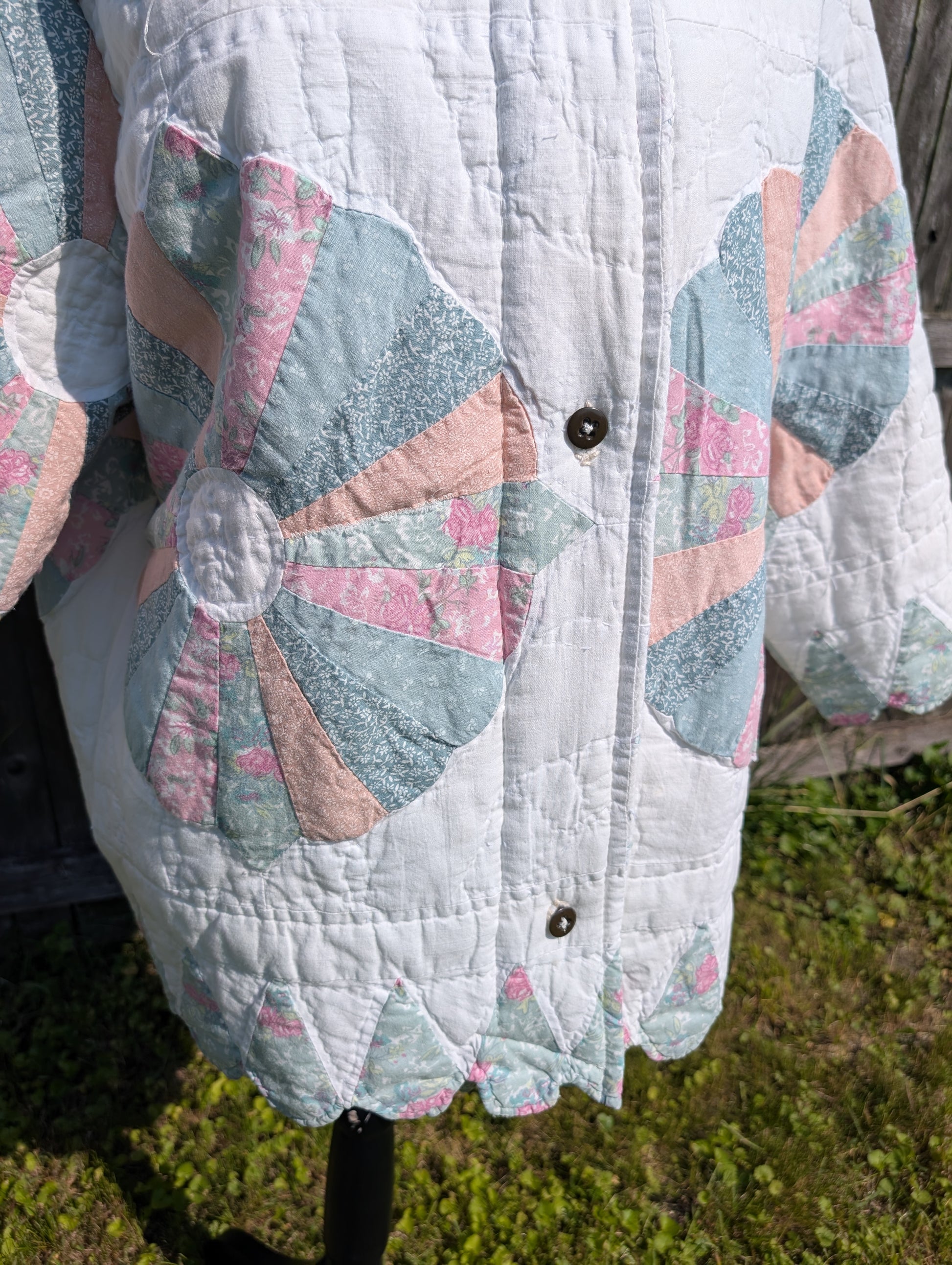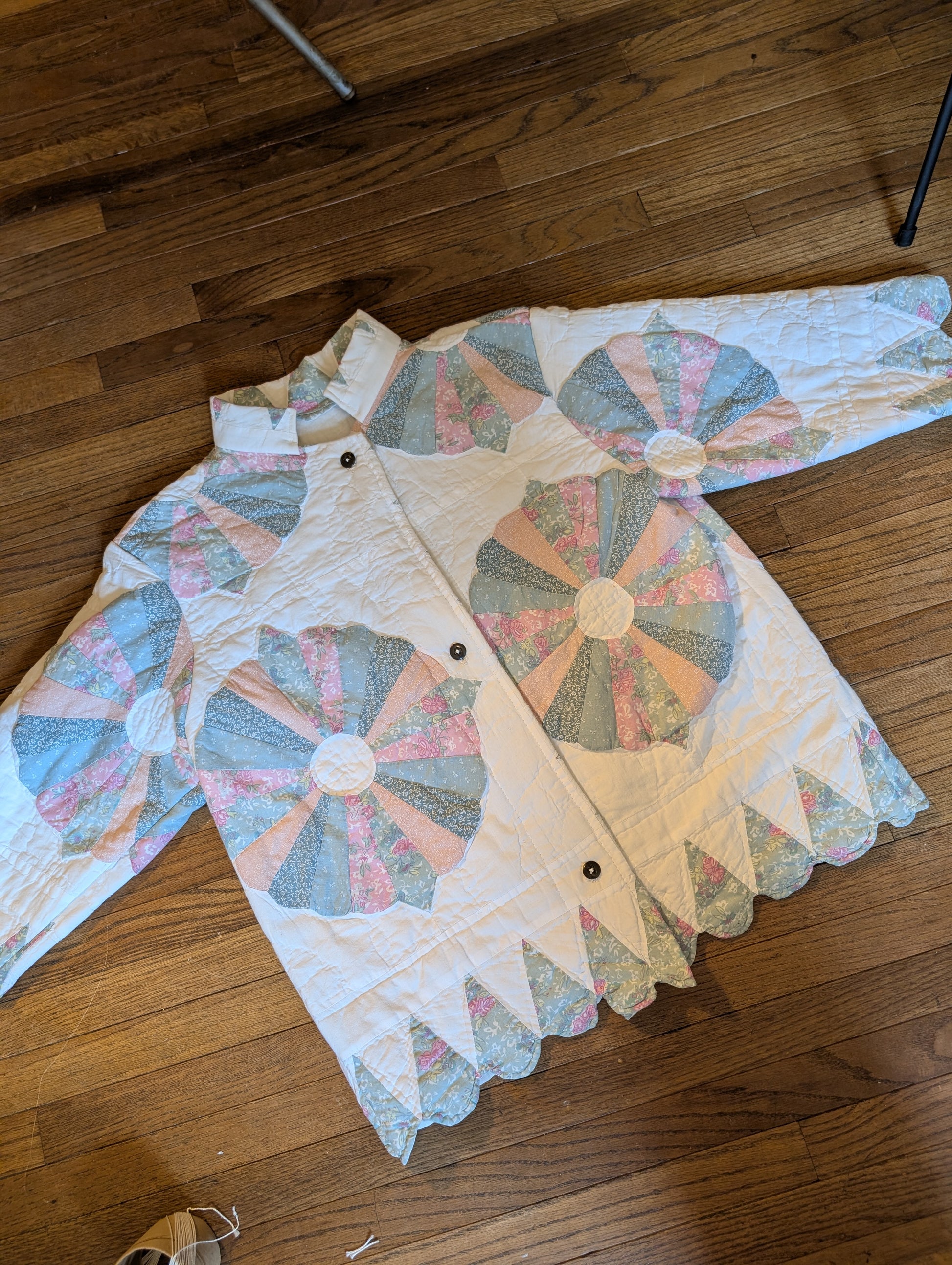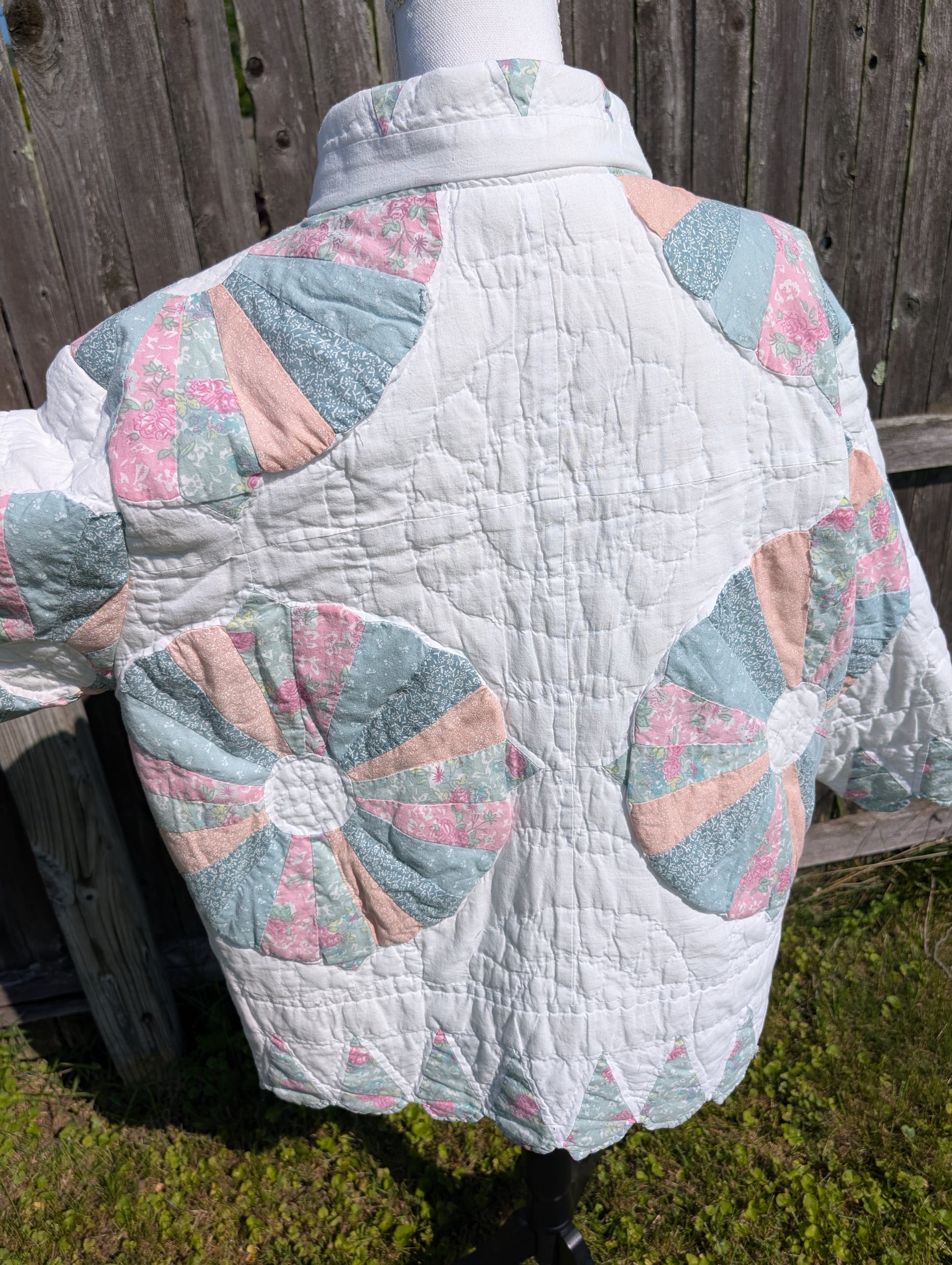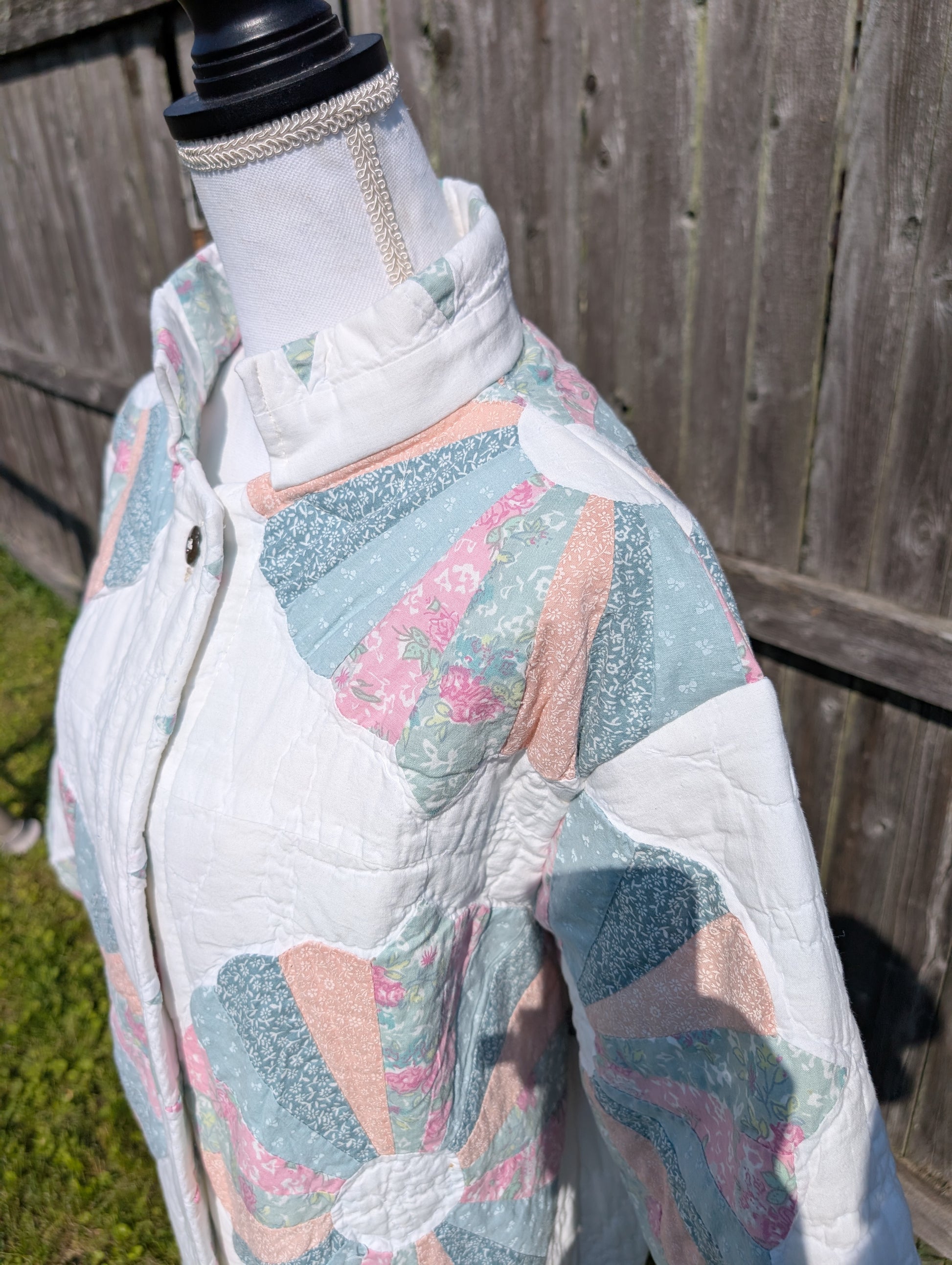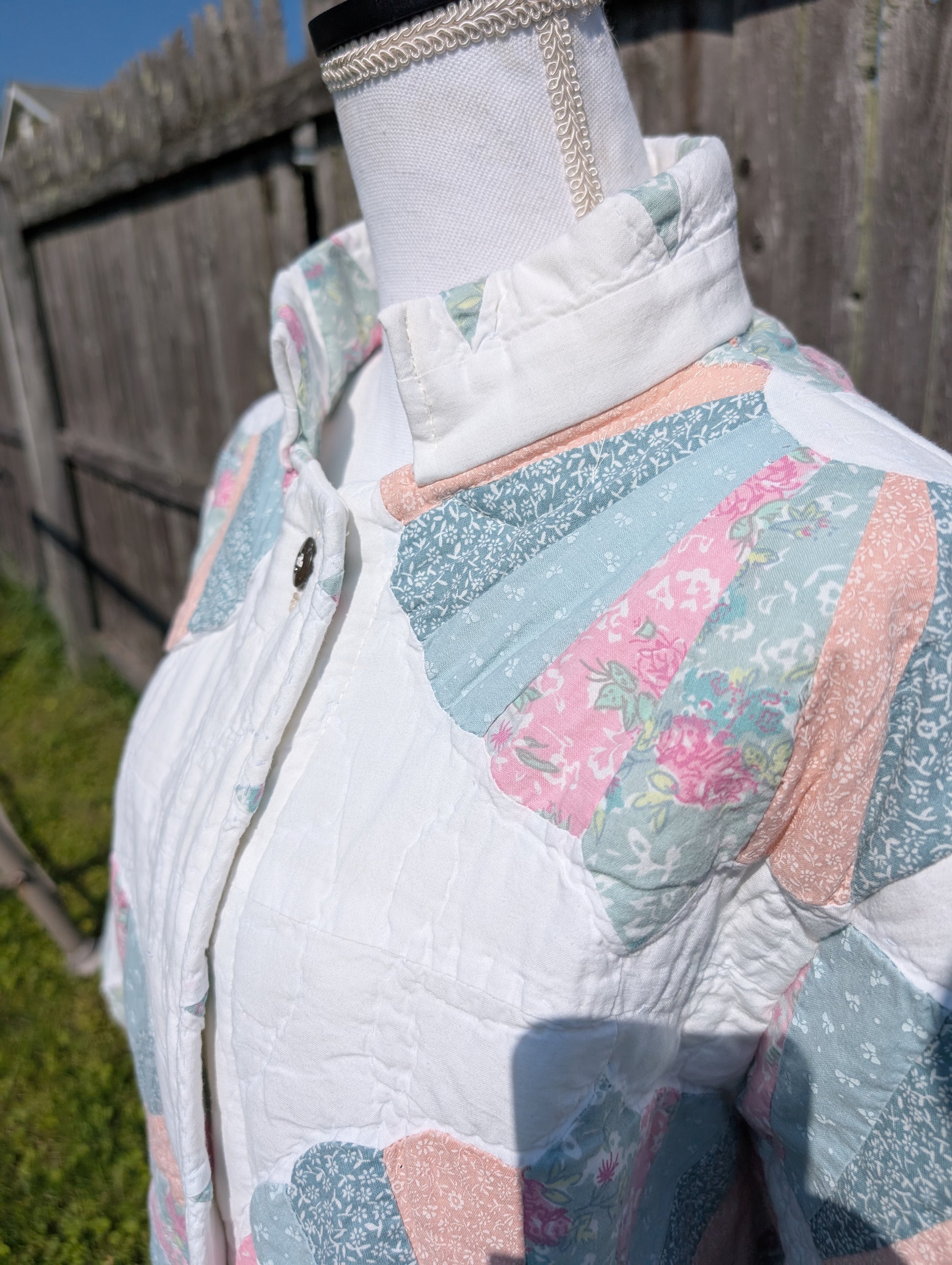 Jacket handmade by me using a quilt. French seams inside. Three left side buttons hand sewn on. Fits like a boxy medium / cropped large. Some mending done on the quilt blocks. Please compare measurements with your own measurements as I do not accept returns / refunds. Thank you for understanding.