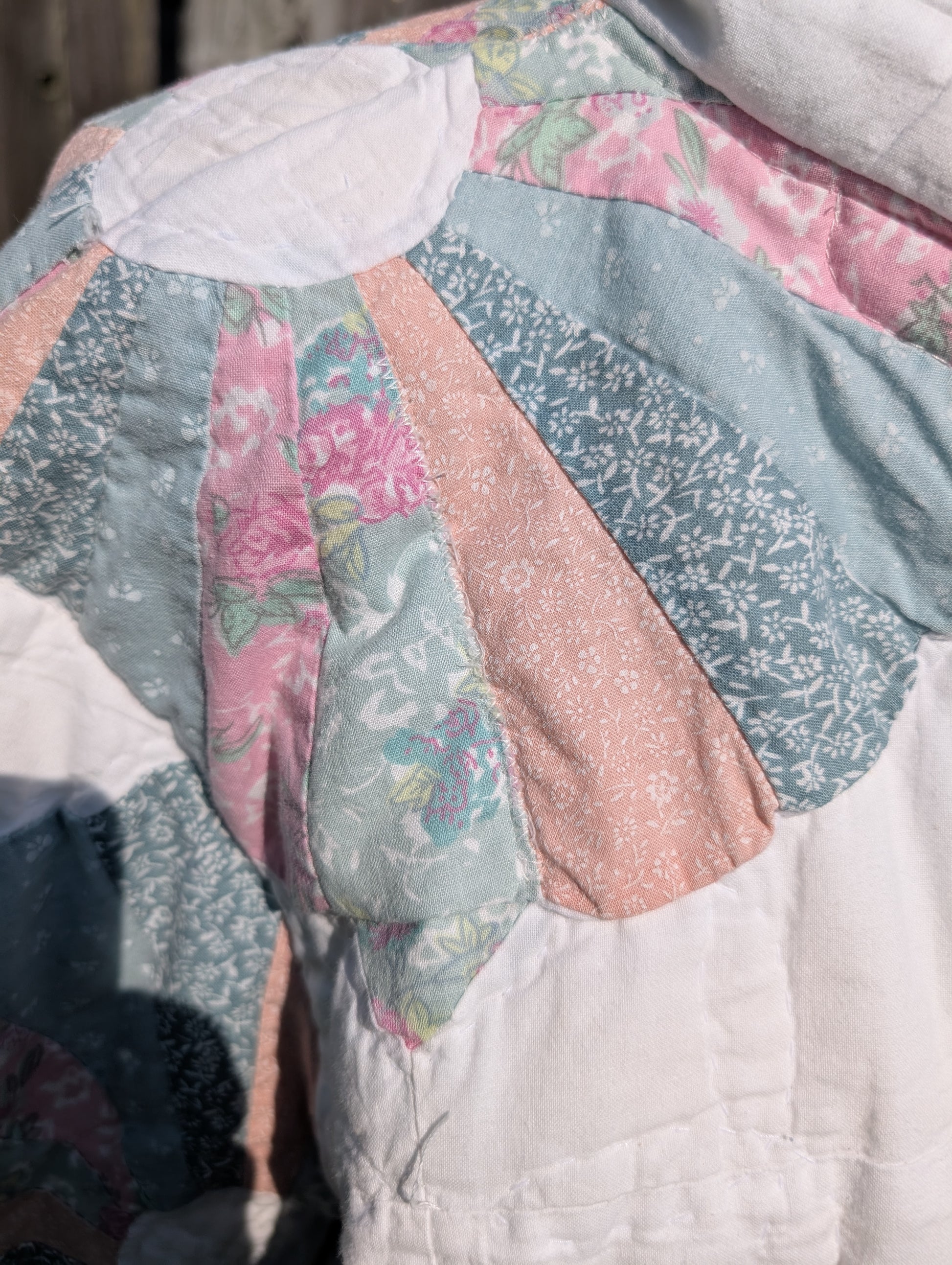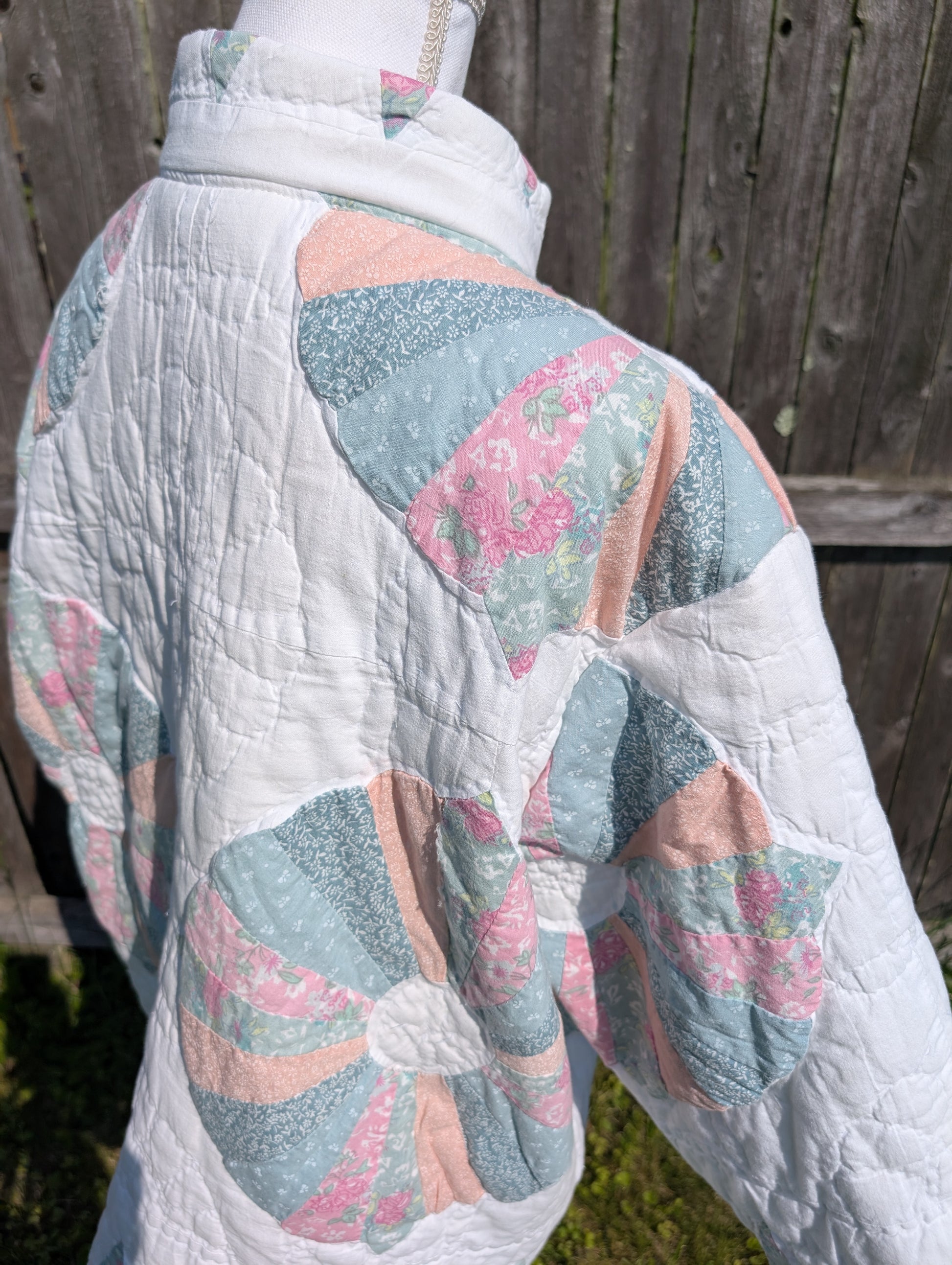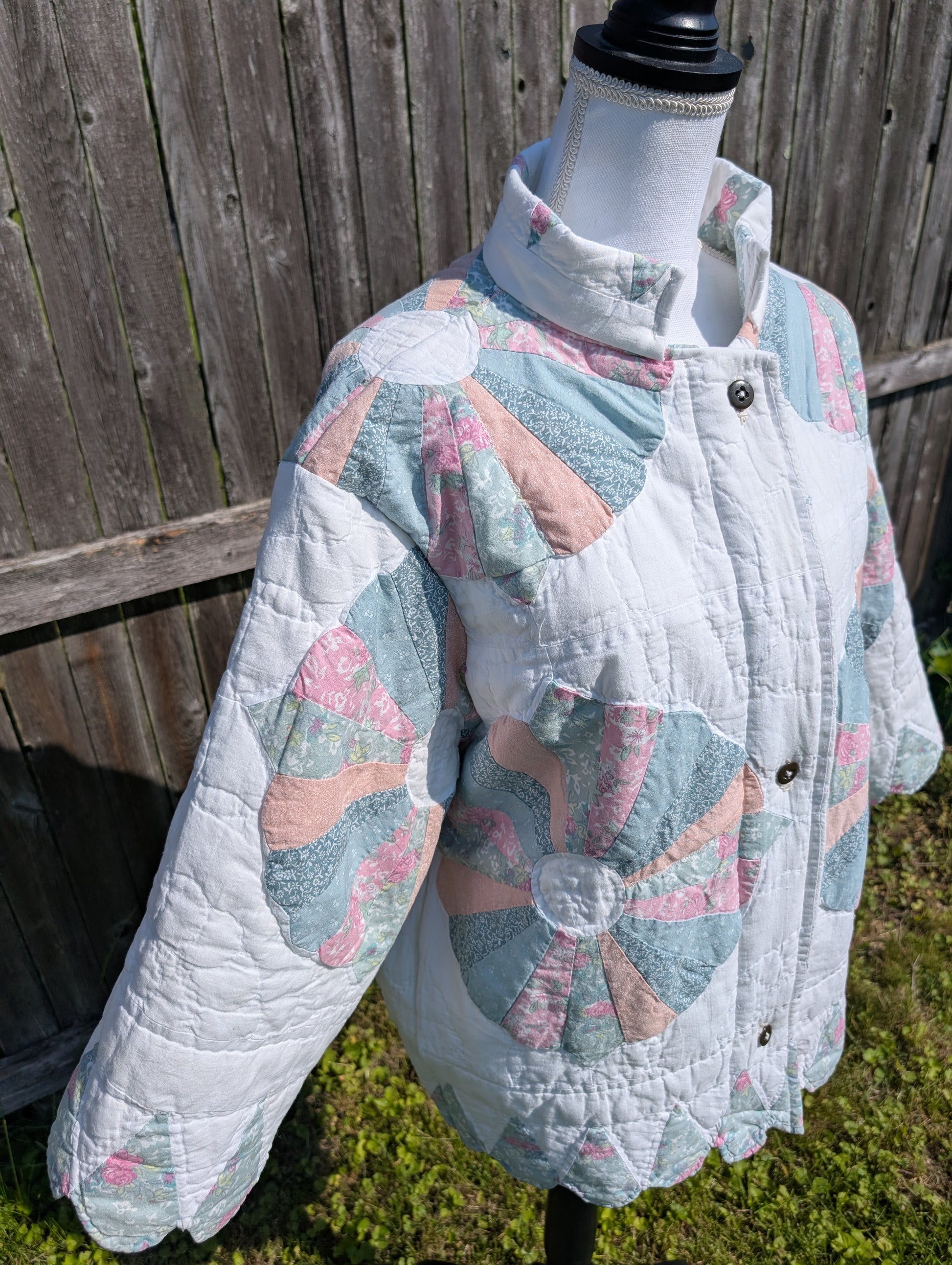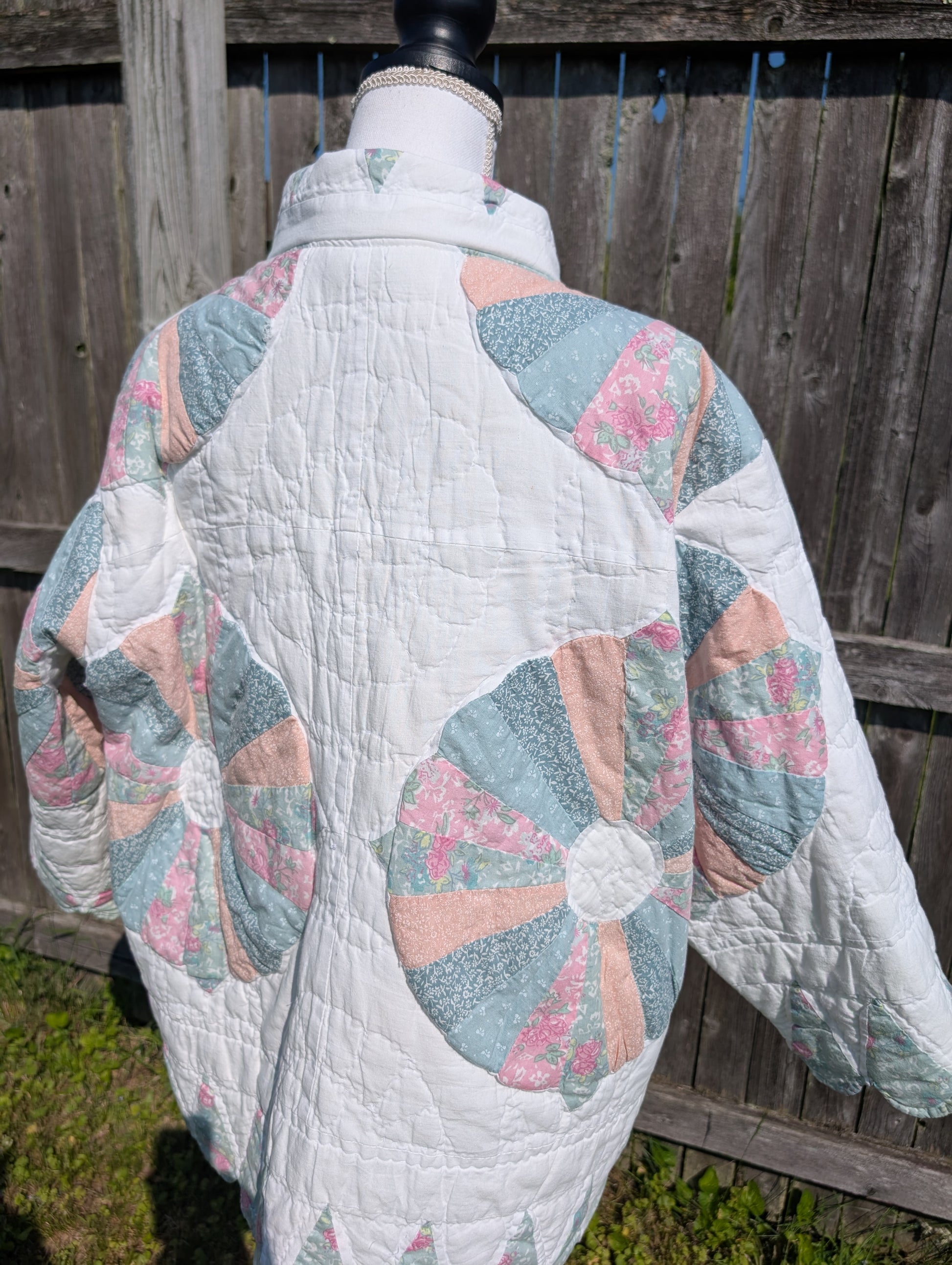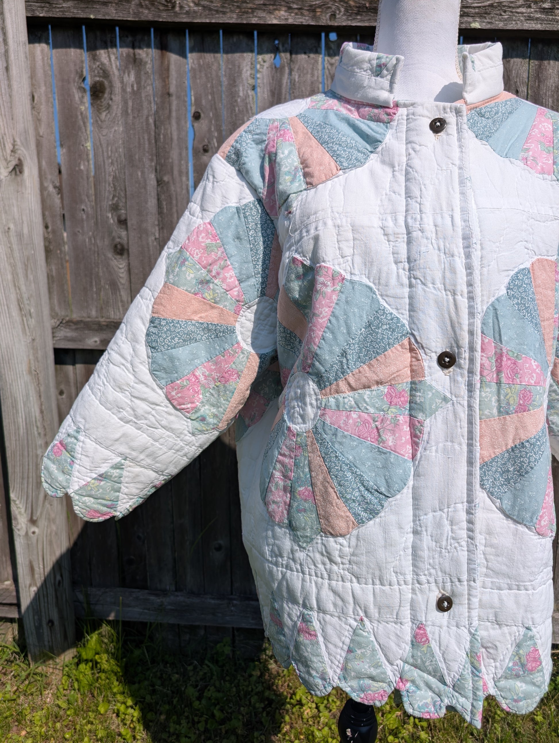 Jacket handmade by me using a quilt. French seams inside. Three left side buttons hand sewn on. Fits like a boxy medium / cropped large. Some mending done on the quilt blocks. Please compare measurements with your own measurements as I do not accept returns / refunds. Thank you for understanding.
