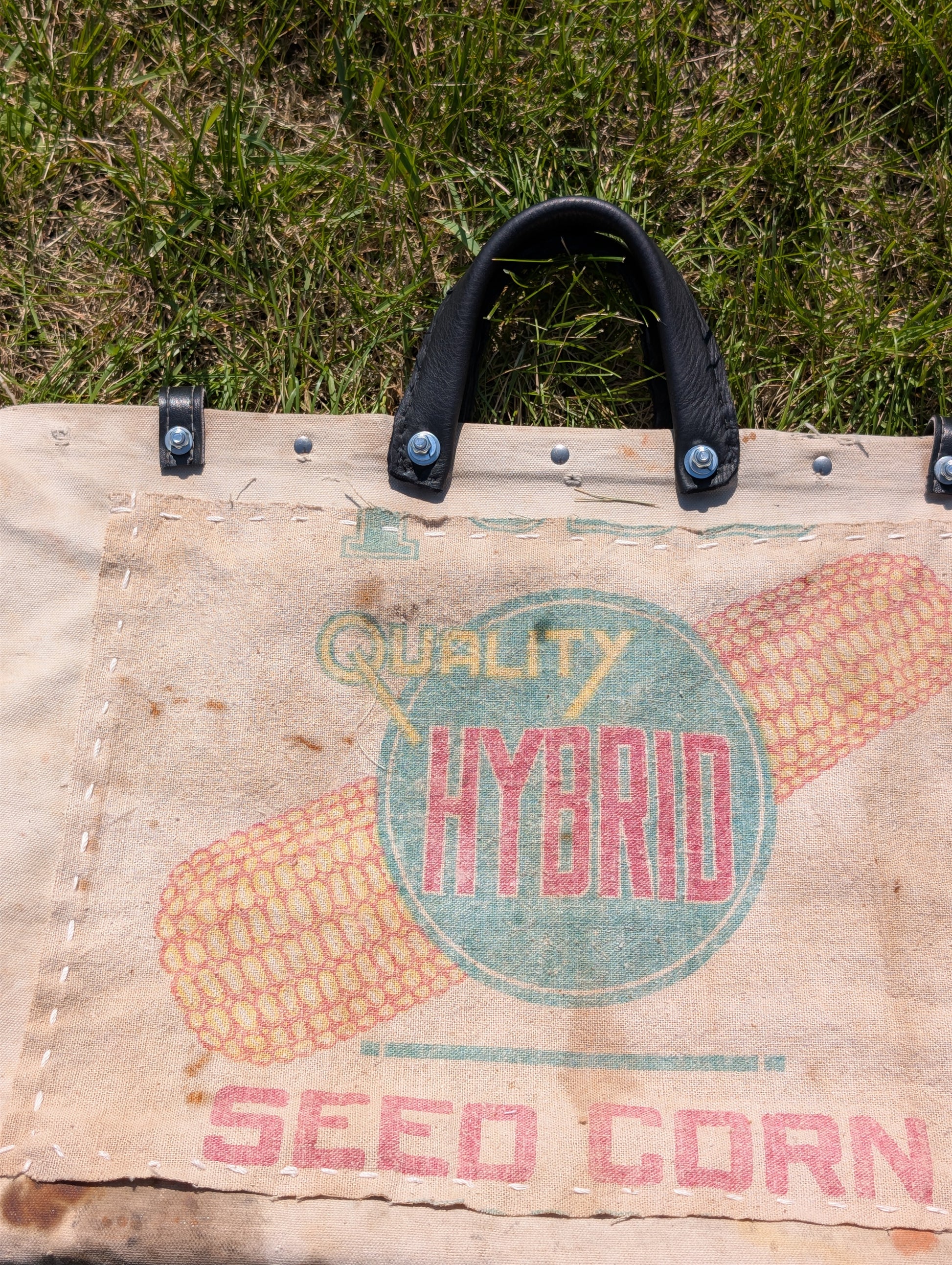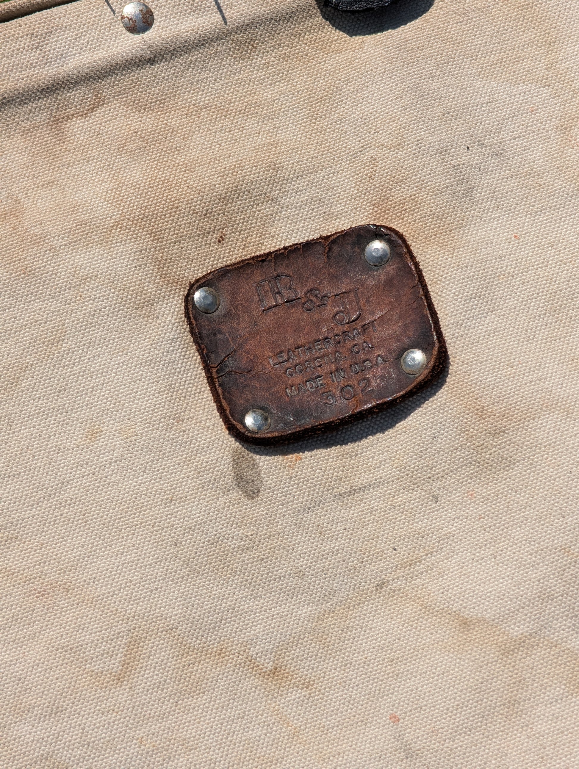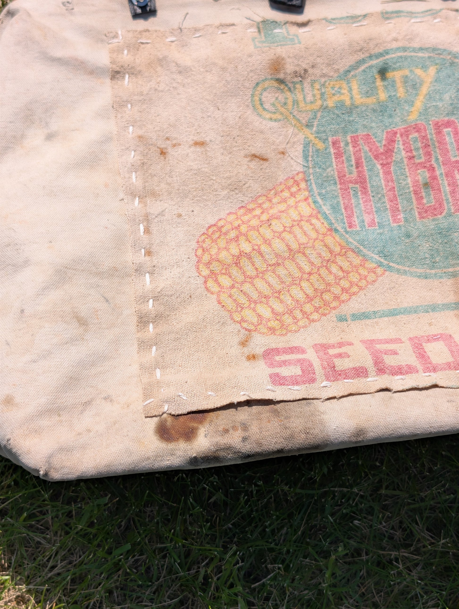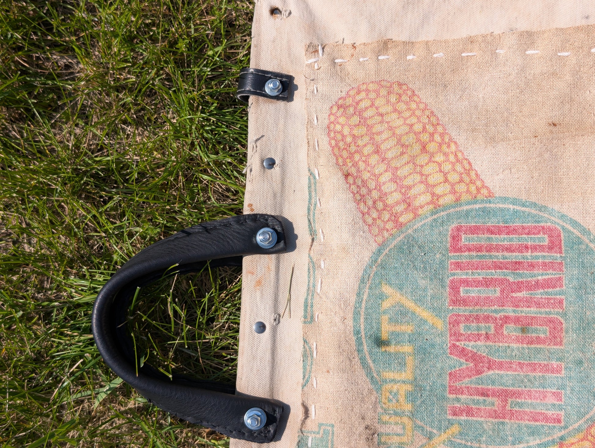 Vintage bag with feed sack graphic hand sewn on. The original handles and straps on this bag were dry rotted so I made new handles out of repurposed leather and hand sewed them together. I repurposed some old leather buckle straps I had laying around as well. I mended a hole in the bag by hand using a scrap piece of old military duffle bag canvas.