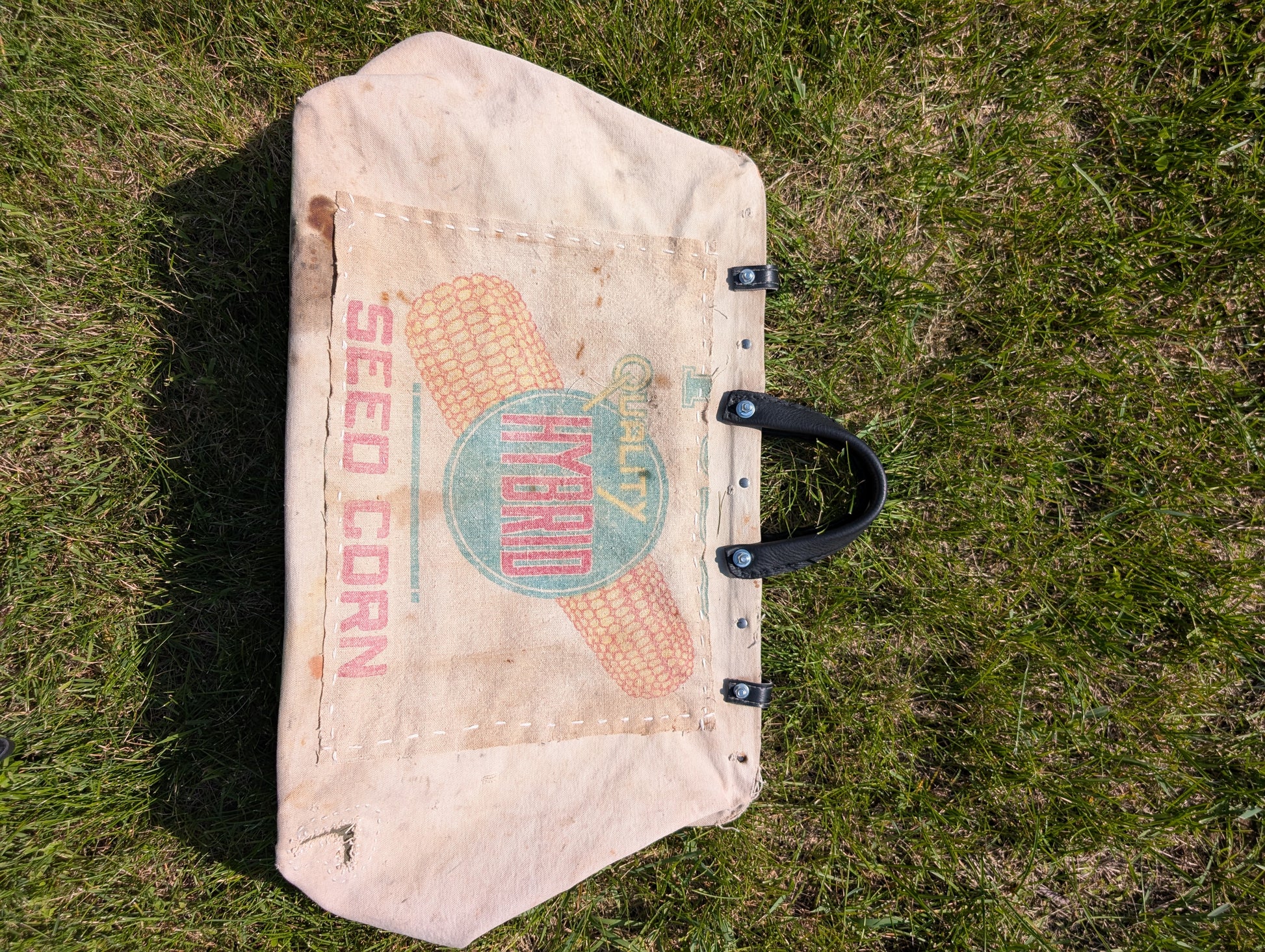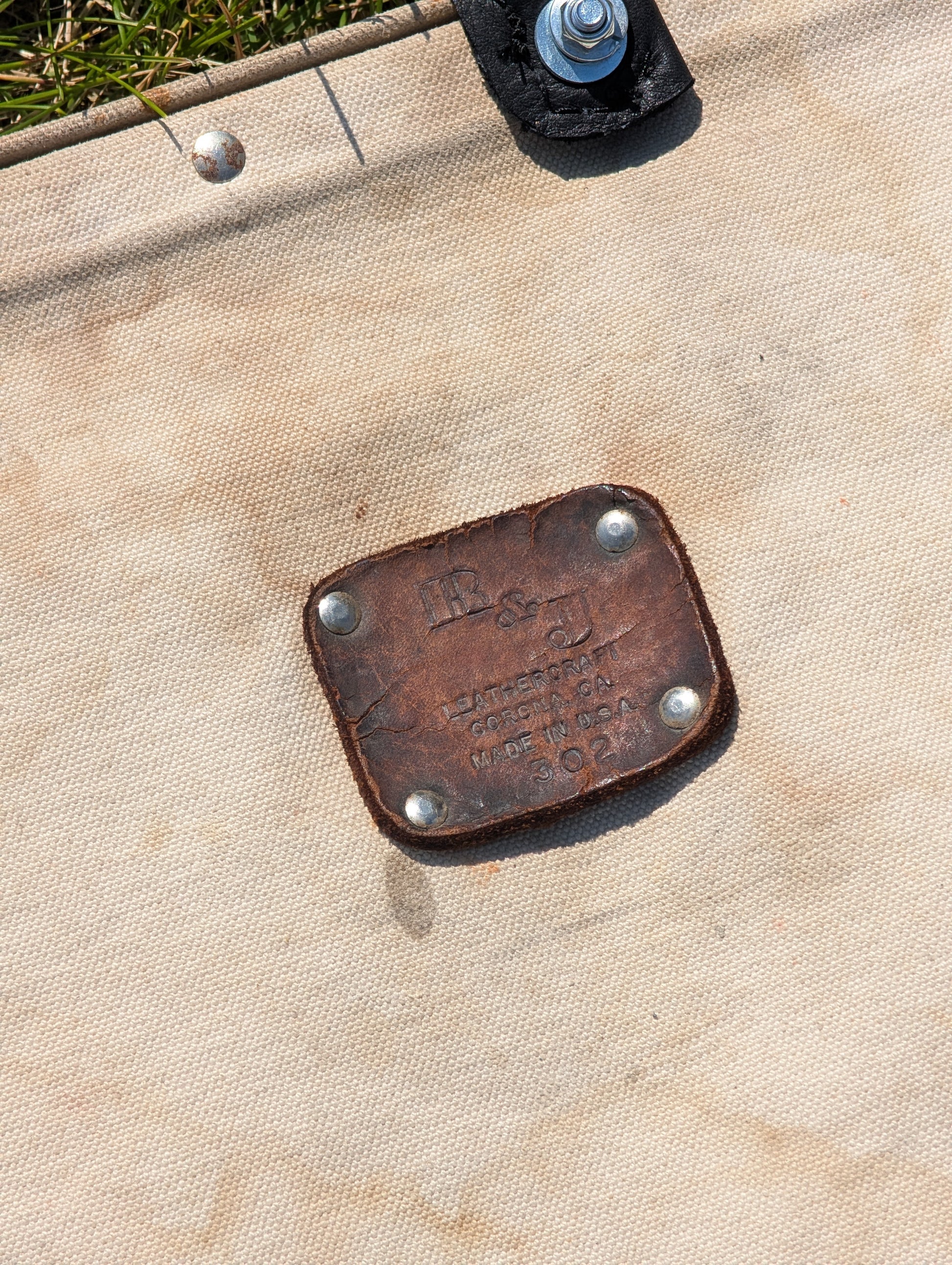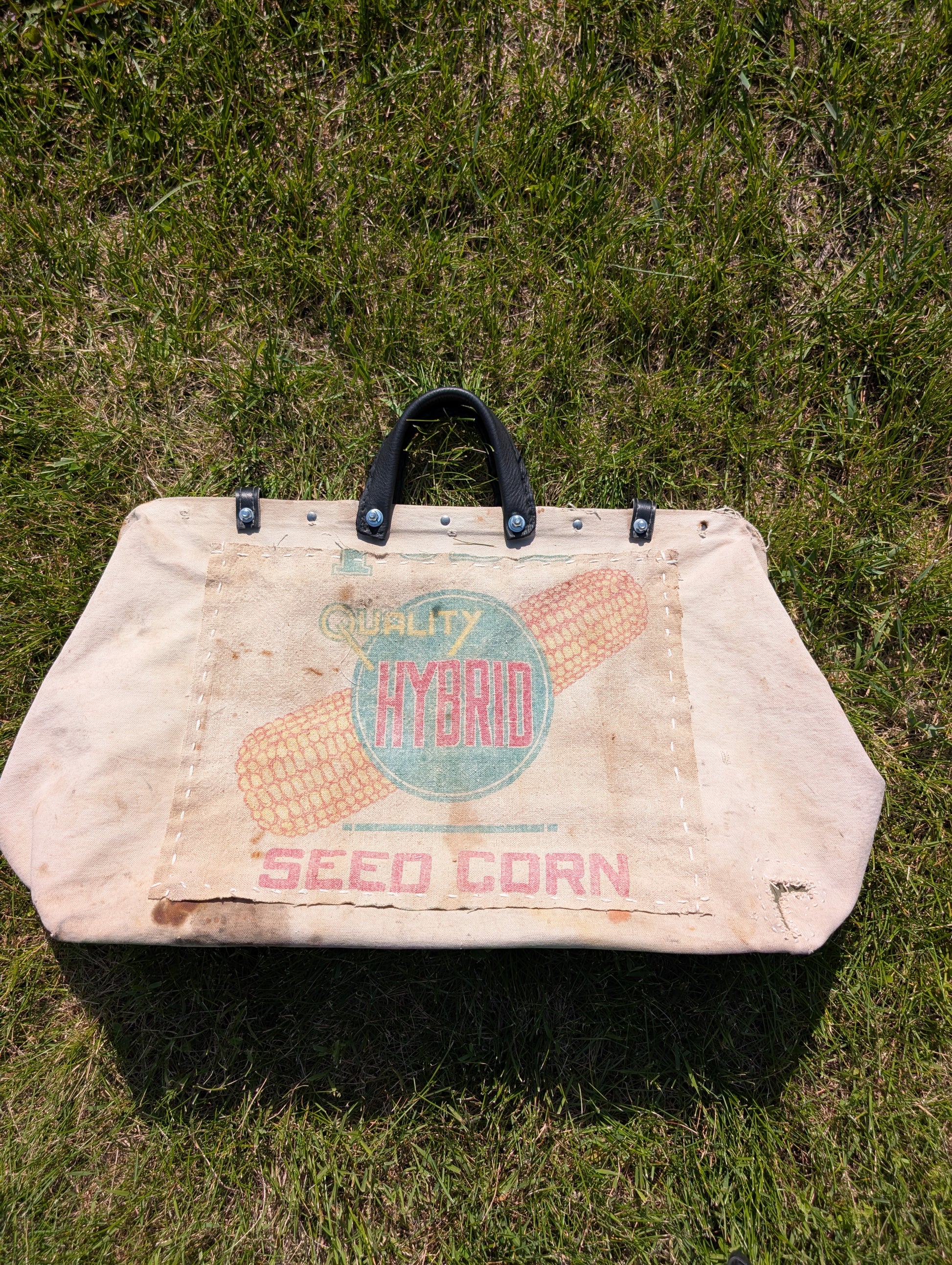 Vintage bag with feed sack graphic hand sewn on. The original handles and straps on this bag were dry rotted so I made new handles out of repurposed leather and hand sewed them together. I repurposed some old leather buckle straps I had laying around as well. I mended a hole in the bag by hand using a scrap piece of old military duffle bag canvas.