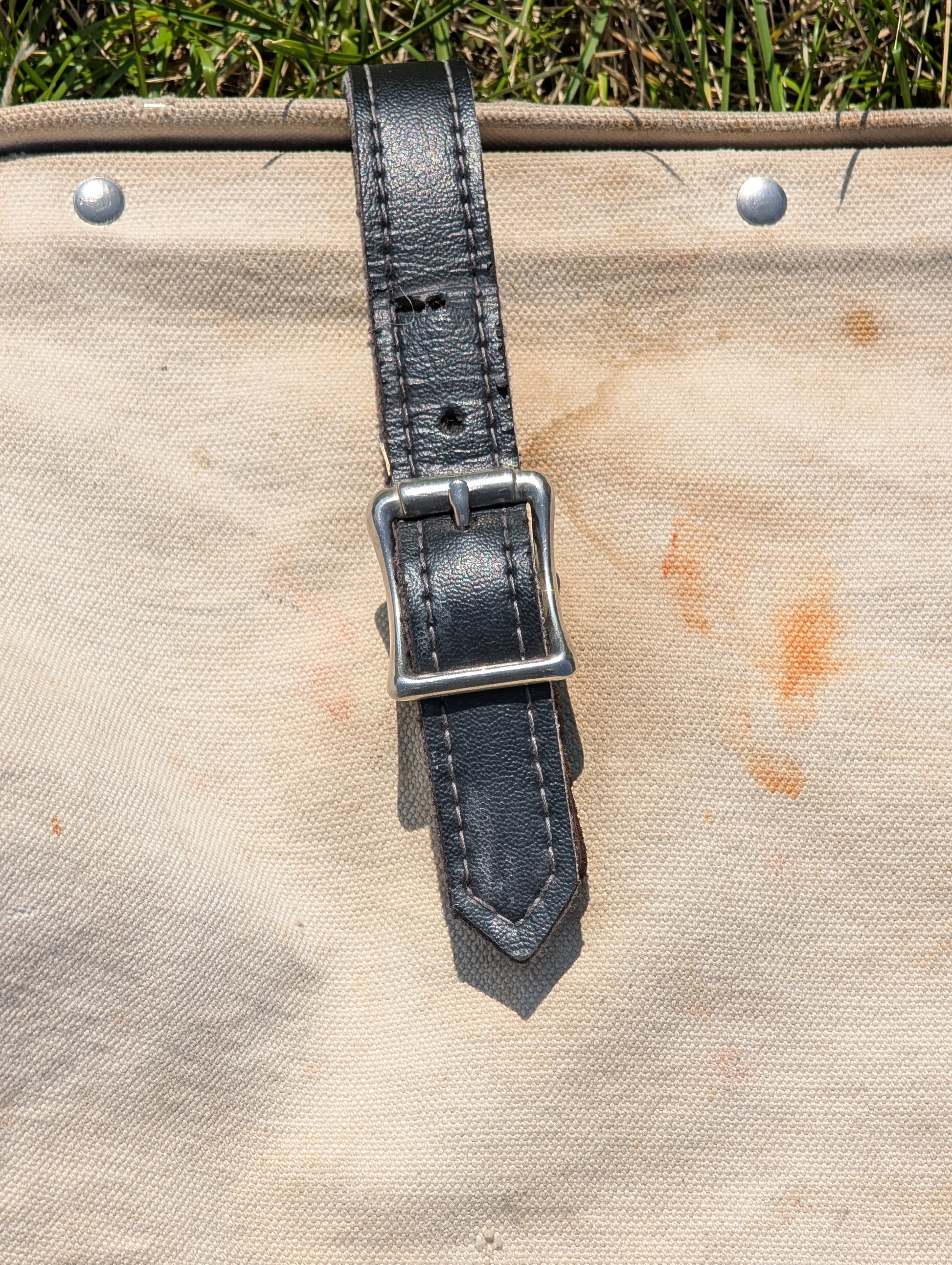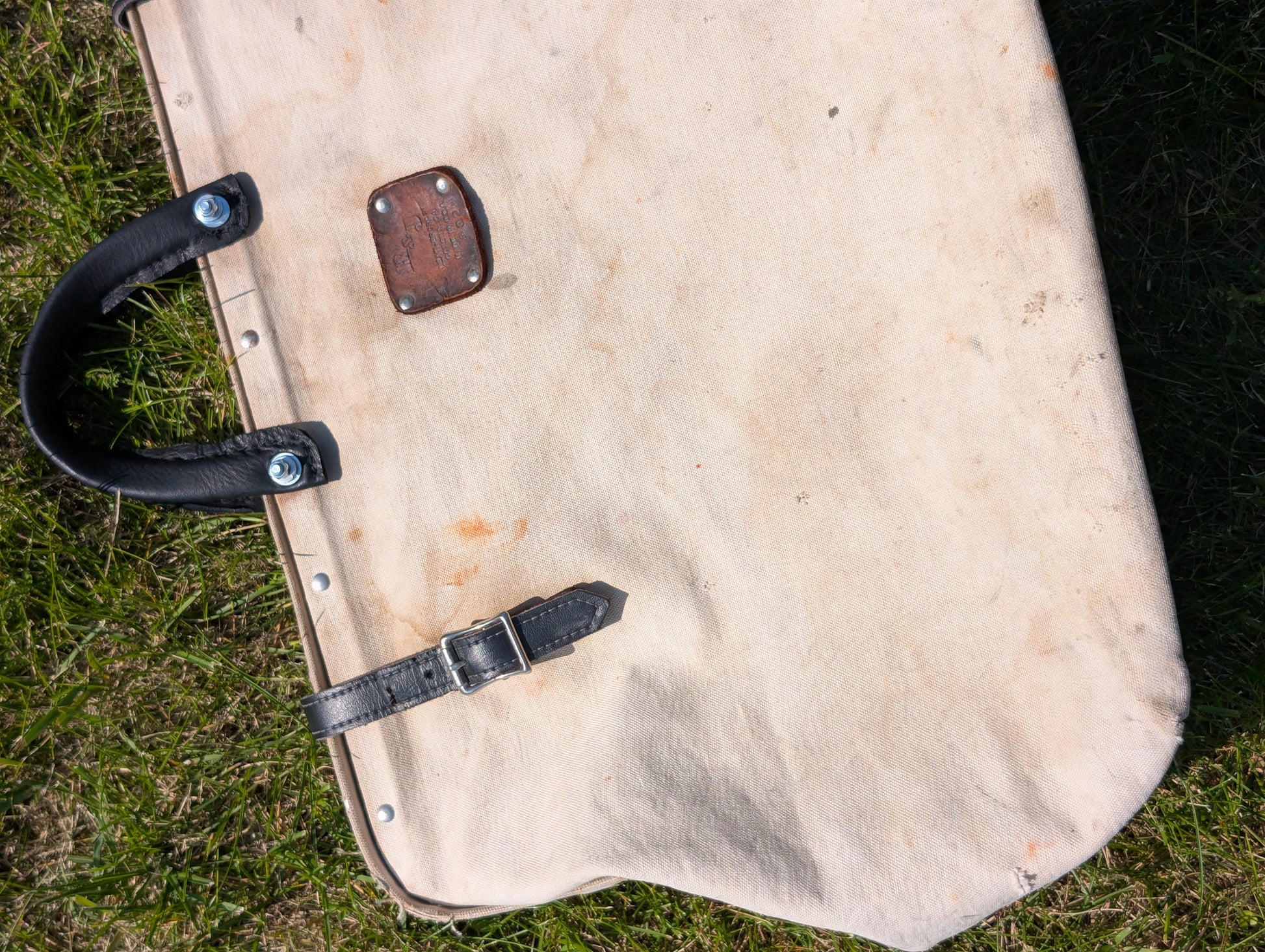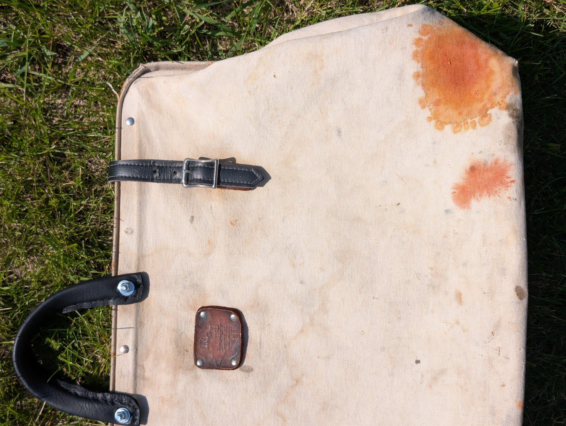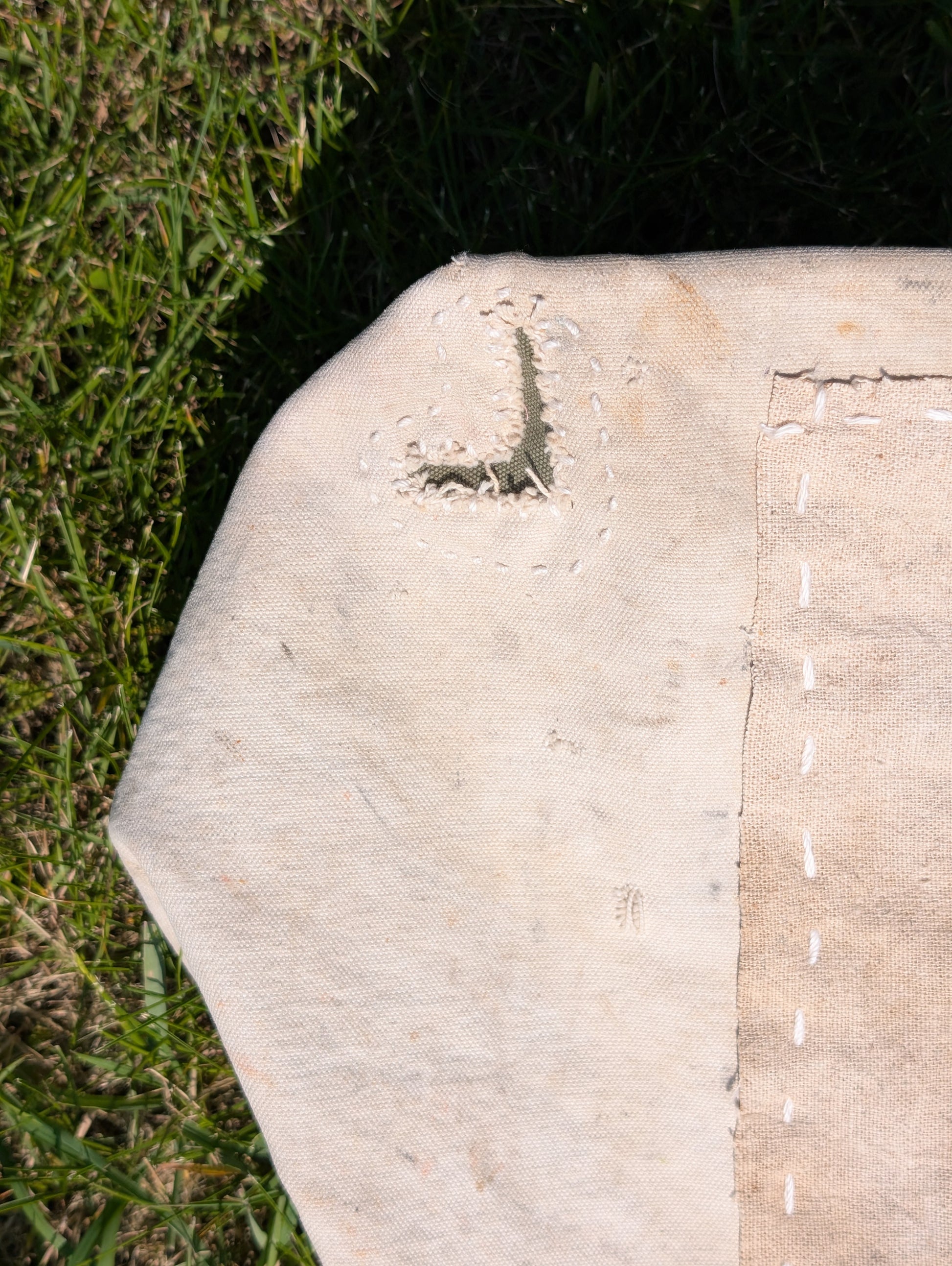 Vintage bag with feed sack graphic hand sewn on. The original handles and straps on this bag were dry rotted so I made new handles out of repurposed leather and hand sewed them together. I repurposed some old leather buckle straps I had laying around as well. I mended a hole in the bag by hand using a scrap piece of old military duffle bag canvas.