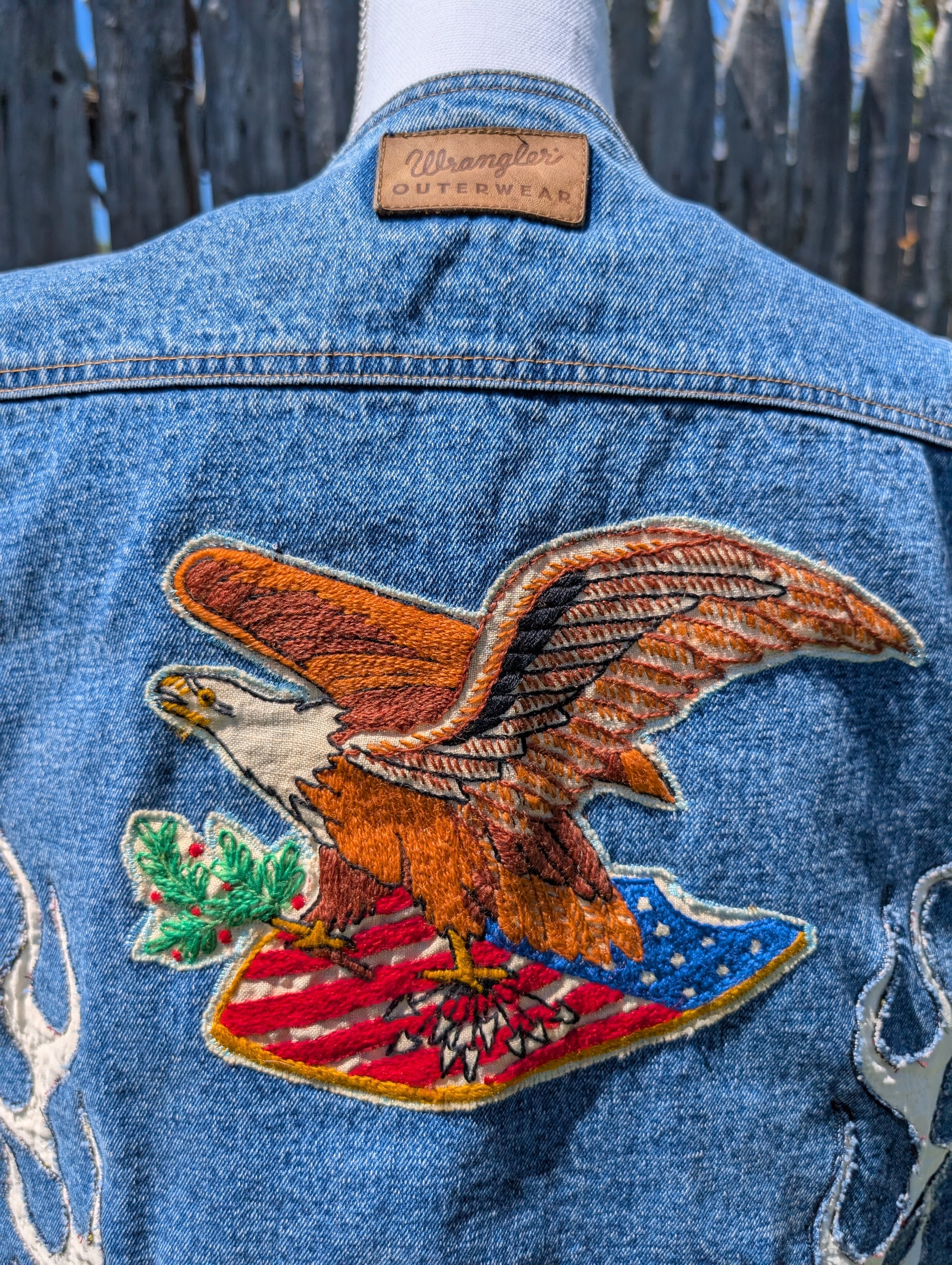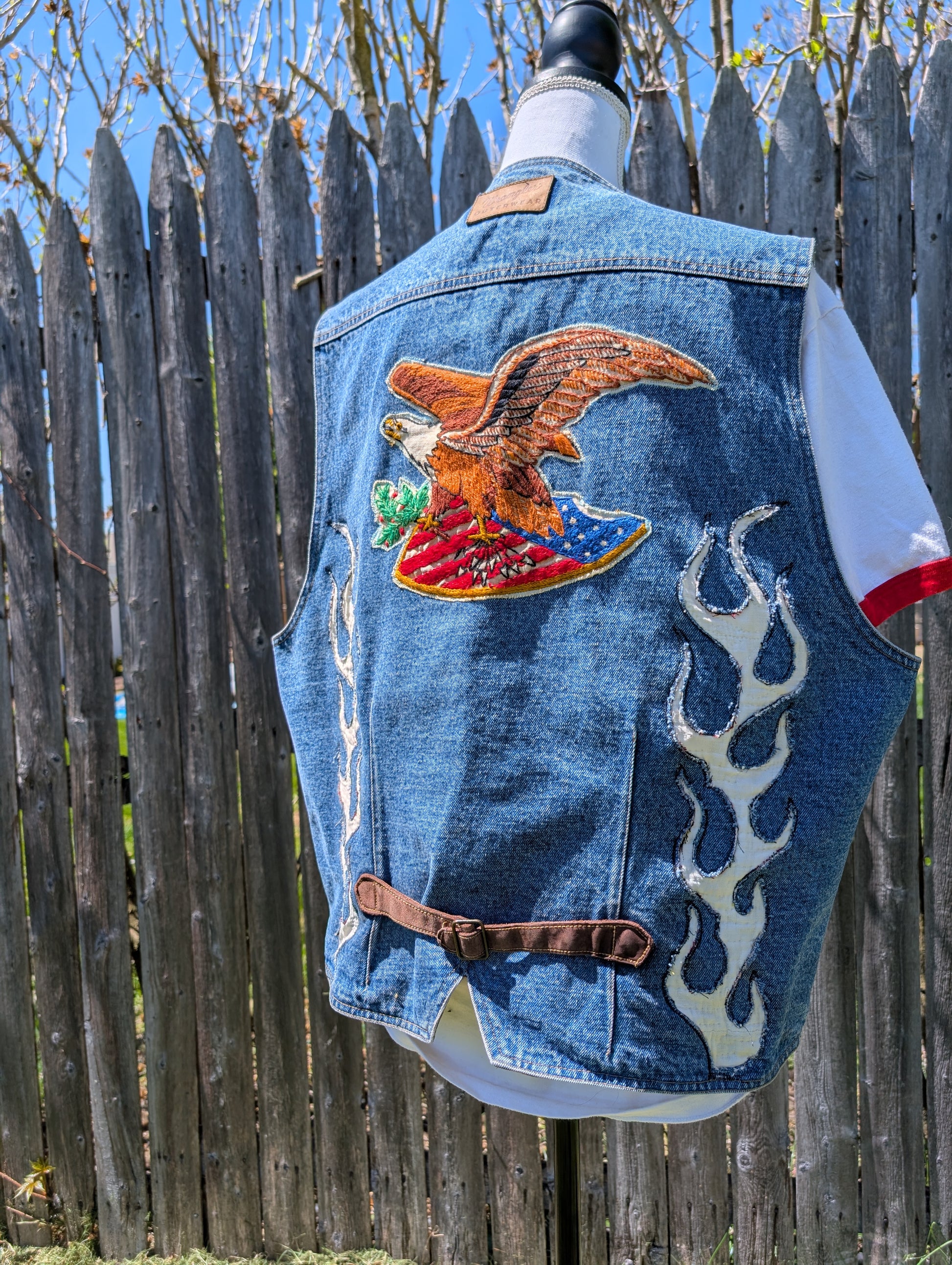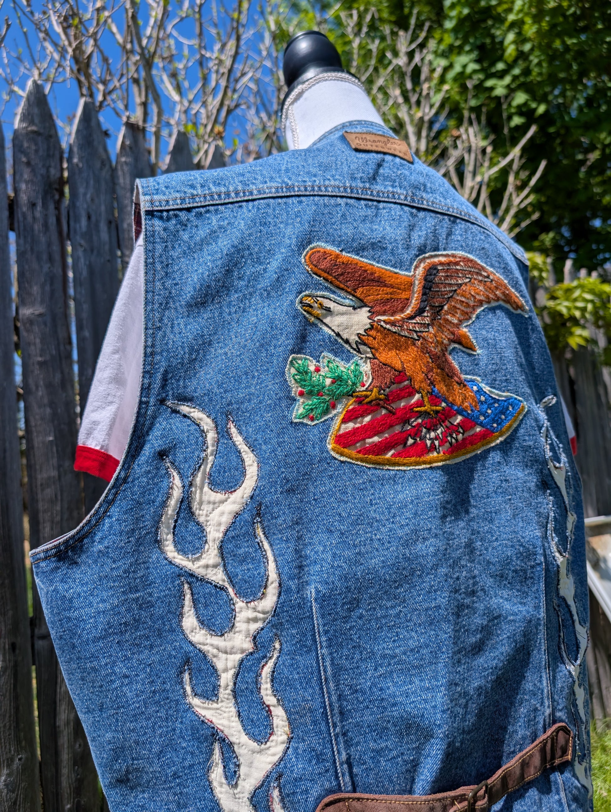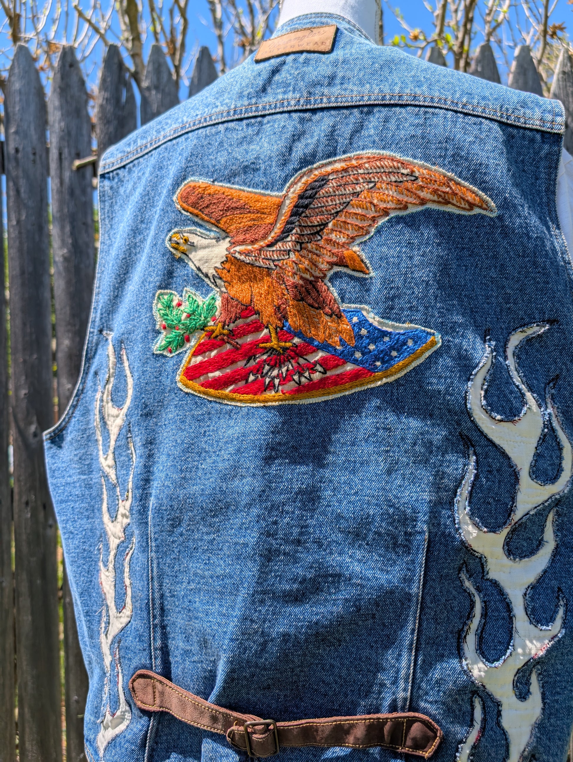 Wrangler flannel lined denim vest upcycled with flames from a vintage quilt and a eagle embroidery piece from the 1970s patched on.