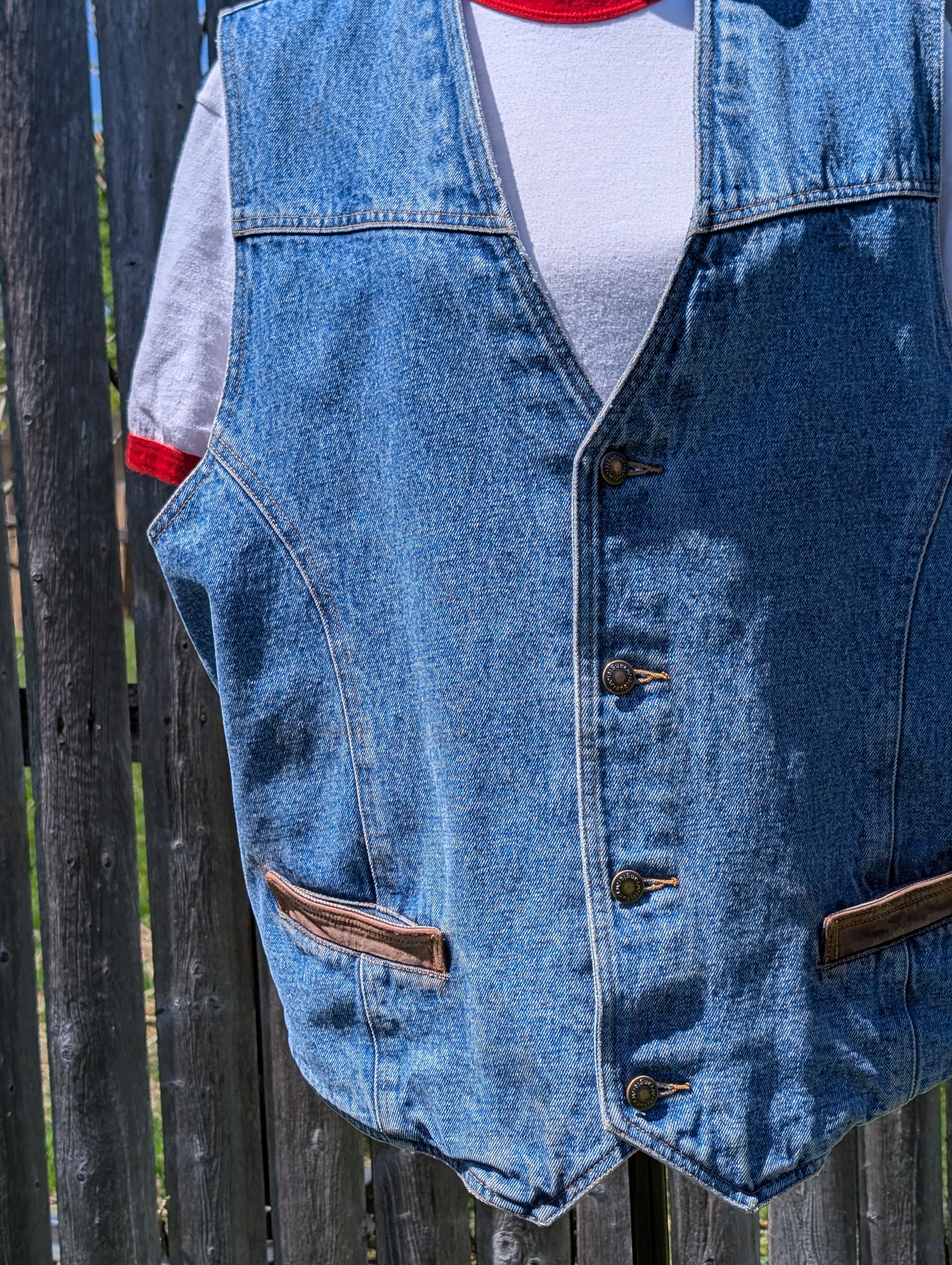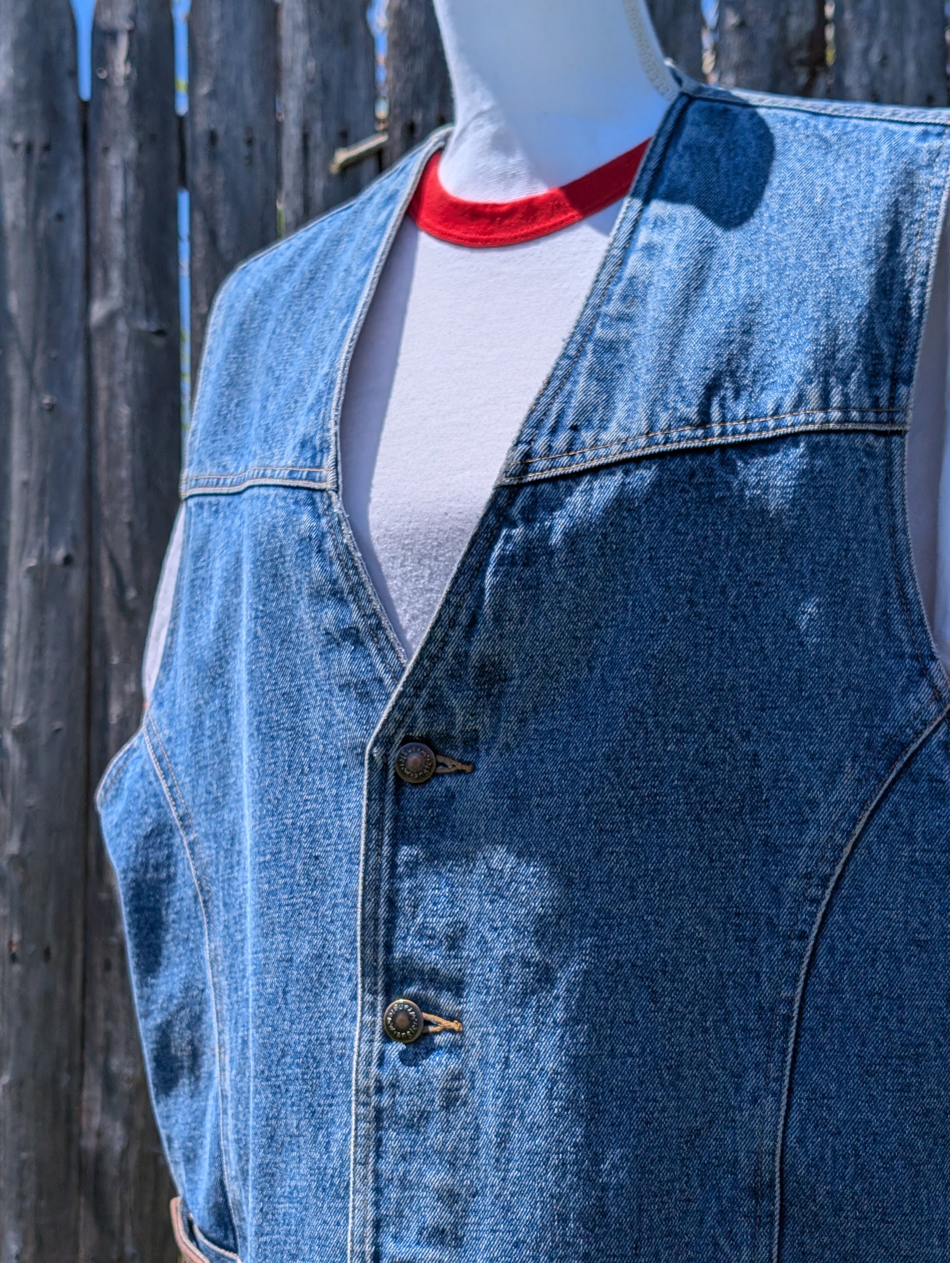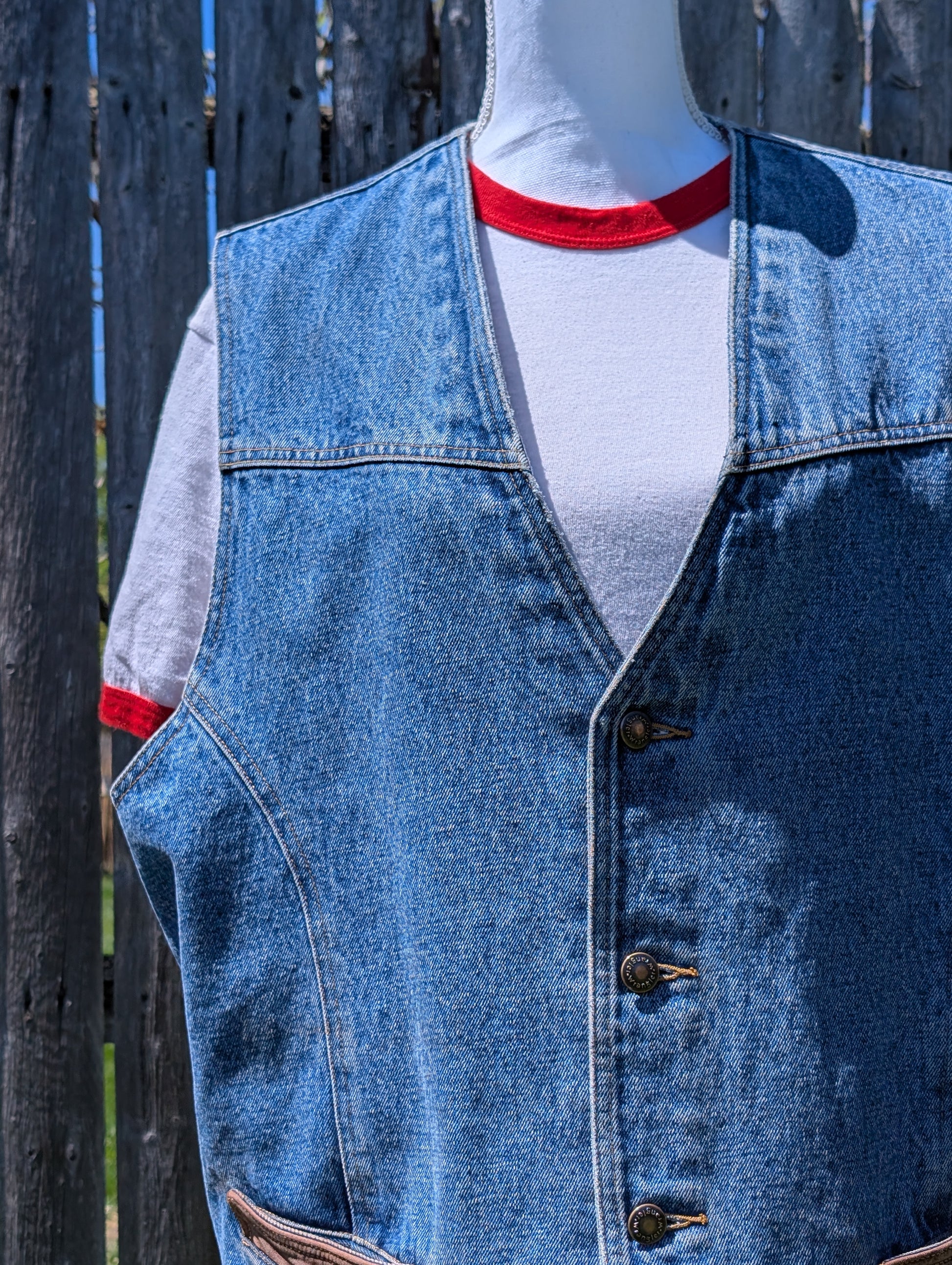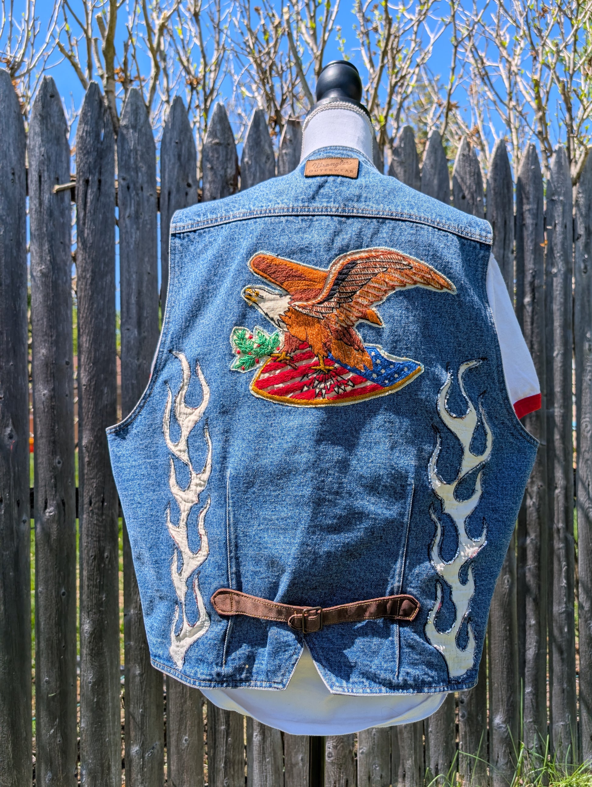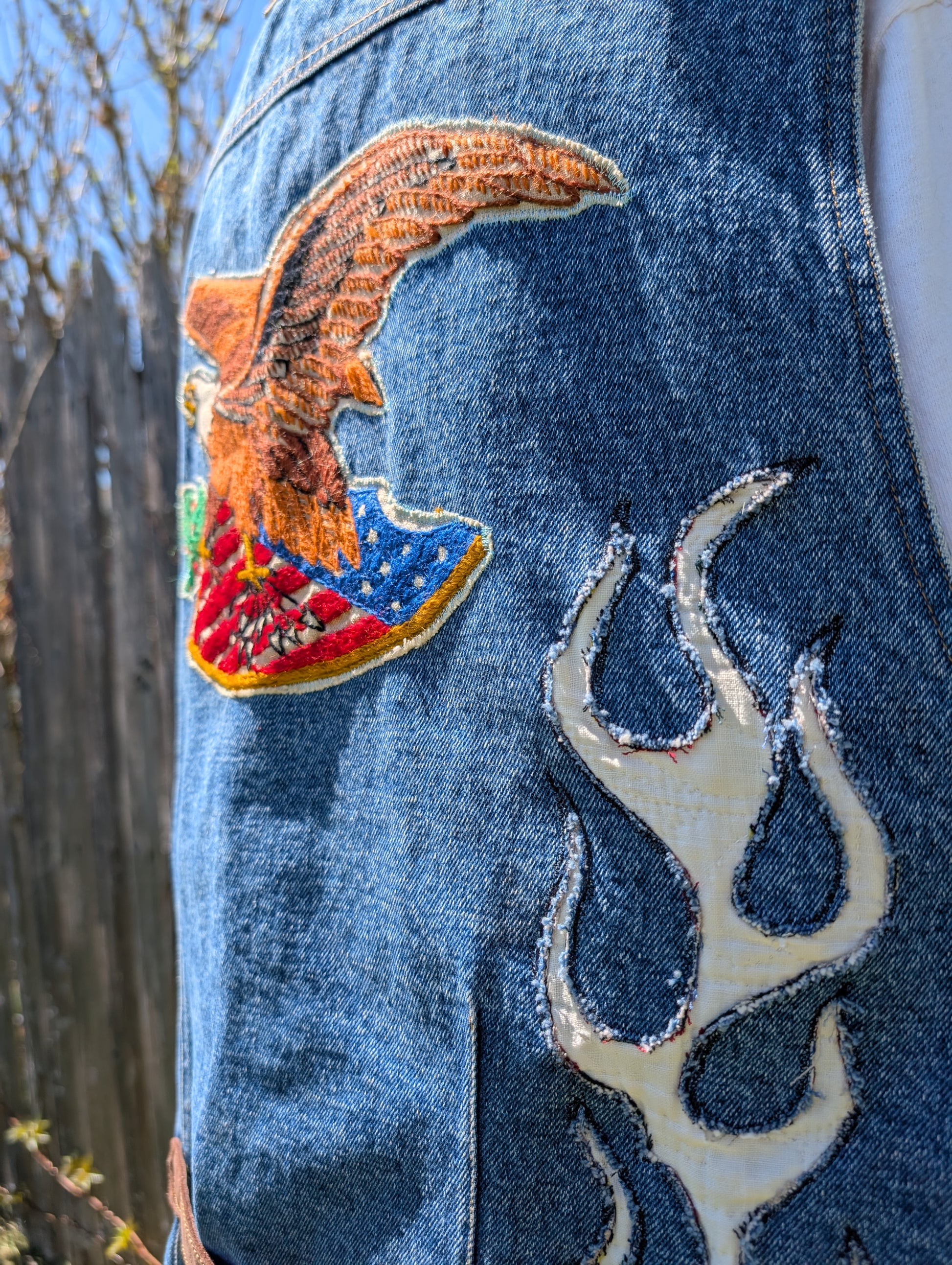 Wrangler flannel lined denim vest upcycled with flames from a vintage quilt and a eagle embroidery piece from the 1970s patched on.